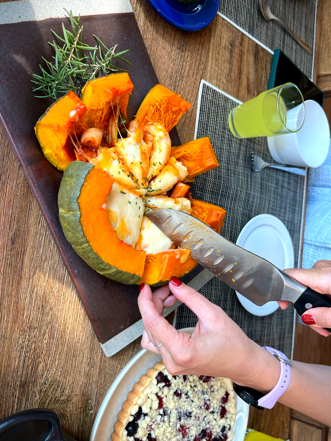 5. 쪄둔 단호박 안에 4번 재료로 채우고, 중간중간 모짜렐라 치즈를 넣어준다.