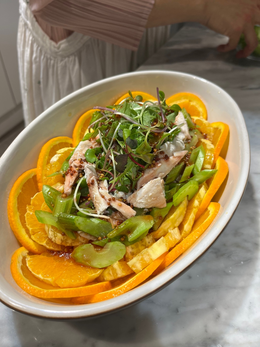 4. 오렌지>샐러리>닭가슴살 순으로 플레이팅 한다