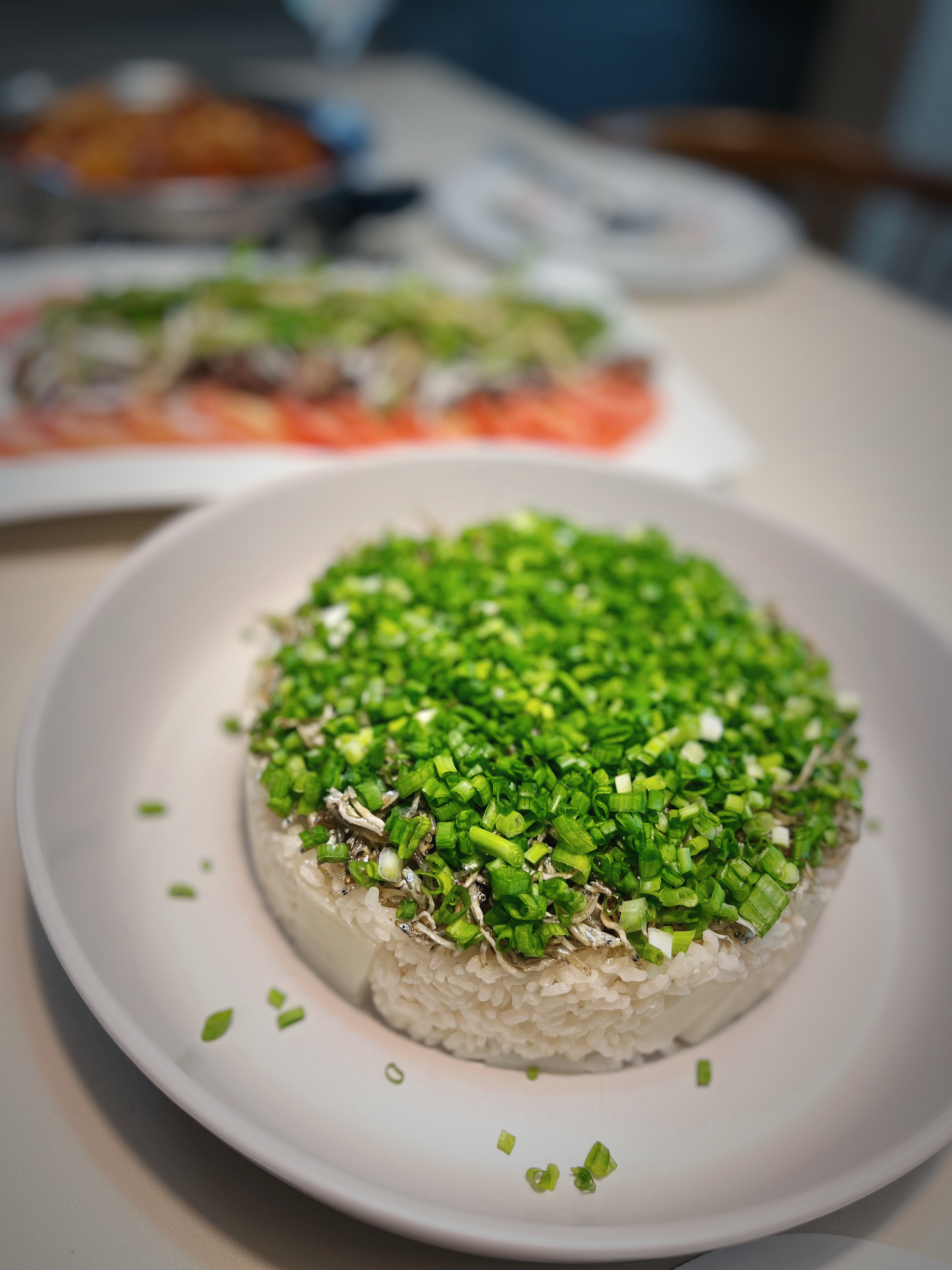 5. 접시 위에 무스틀을 올리고, 밥 > 멸치 > 쪽파 순으로 올려서 낸다
